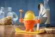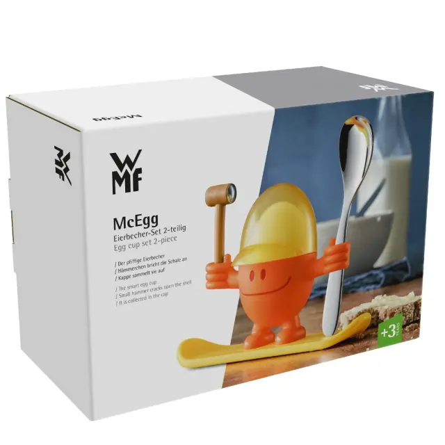 WMF jajčna skodelica McEgg z ujemajočo se žlico za otroke od 3. leta. McEgg je ime živahne skodelice za kuhano jajce, ki jo servirate kar na jedilno mizo. Preprosto uporabite vrtljivo kladivo, da počite lupino in zberete jajčne lupine v pokrov.