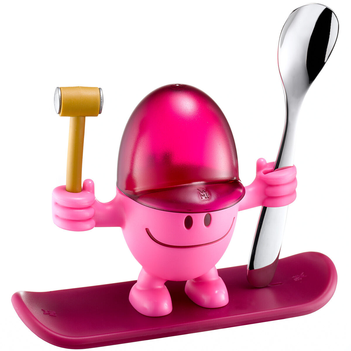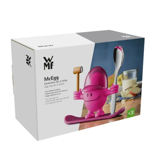 WMF jajčna skodelica McEgg z ujemajočo se žlico za otroke od 3. leta. McEgg je ime živahne skodelice za kuhano jajce, ki jo servirate kar na jedilno mizo. Preprosto uporabite vrtljivo kladivo, da počite lupino in zberete jajčne lupine v pokrov.