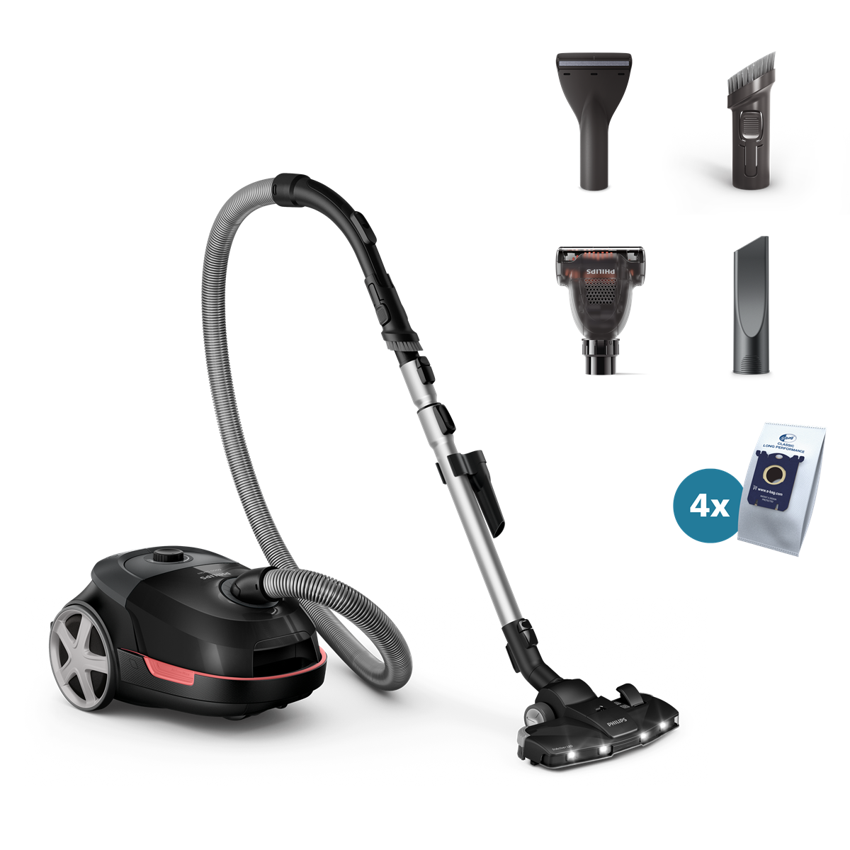 Doživite vrhunsko učinkovitost čiščenja s kombinacijo velike moči sesanja in nastavka TriActive+ LED, ki omogoča odstranjevanje 99,9 %** drobnega prahu. Z nastavkom TriActive+ LED ne boste izpustili nobenega kotička. LED-lučke na sprednjem delu nastavka osvetlijo tla pred vami in v hipu razkrijejo prah, ki ga drugače ne bi videli. LED-lučke samodejno vklopi senzor, ko uporabljate nastavek, in jih izklopi, ko ga ne. Priložene so 3 baterije AA.