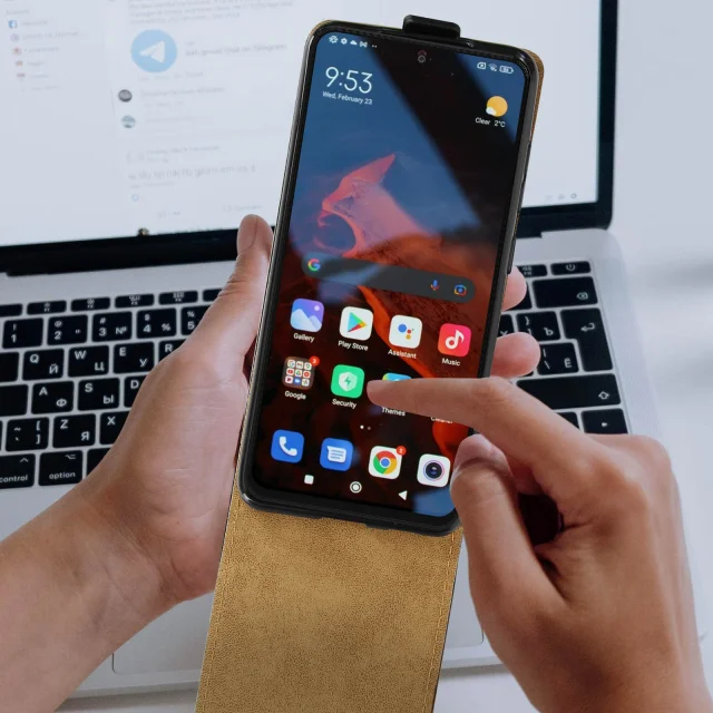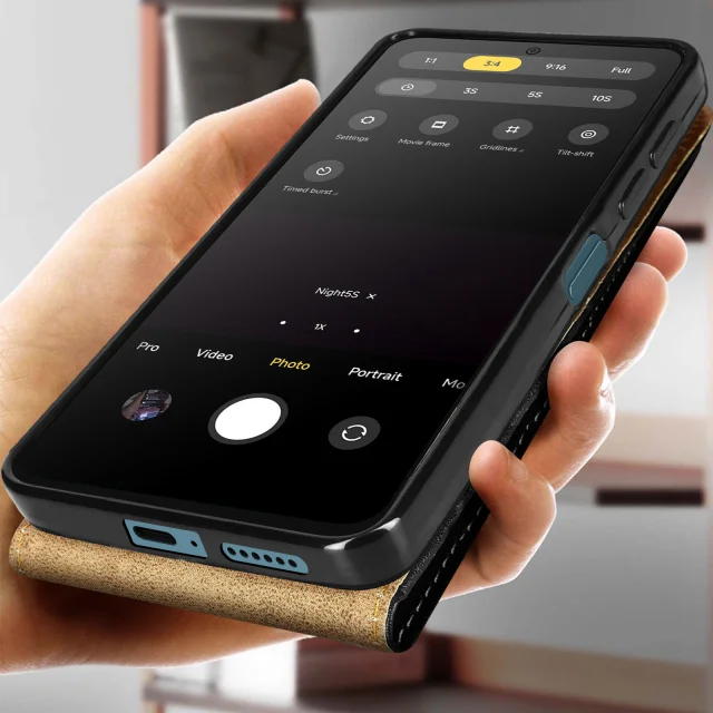 Vertikalna preklopna torbica, posebej zasnovana za Xiaomi Redmi Note 11 Pro 5G. Prevleka iz ekološkega usnja z učinkom teksture konjskega usnja za eleganten in eleganten videz. Ponovno pridobite čist zvok in uživajte v glasbi, videoposnetkih in prostoročnih pogovorih. Zagotovljena popolna združljivost z vašim pametnim telefonom.