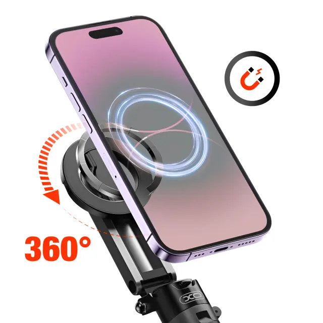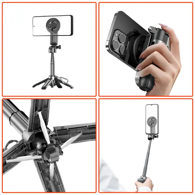 4 funkcije v 1: palica za selfije, stativ, držalo za vlog in mini namizno stojalo za vse vaše potrebe pri snemanju. Zmogljiv magnetni nosilec, združljiv s sistemom MagSafe, s 360-stopinjskim obračanjem za fotografiranje v pokončnem ali ležečem položaju. Vgrajen brezžični sprožilec Bluetooth z 10-urnim delovanjem baterije, ki je kot nalašč za dolge videoposnetke in selfije. Zložljiva, lahka konstrukcija z varnostnim pasom in karabinom za praktičen vsakodnevni prevoz.