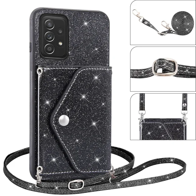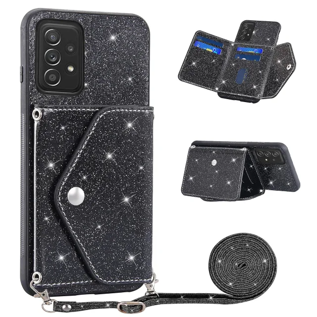 Za Samsung Galaxy A13 4G etui za telefon s trikotnim stojalom za kartice, PU usnje + TPU bleščeč prah