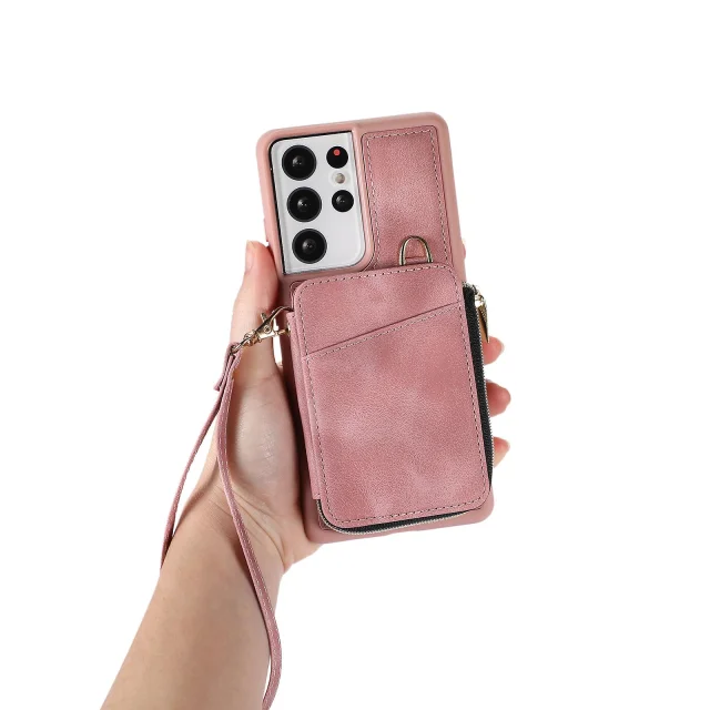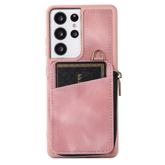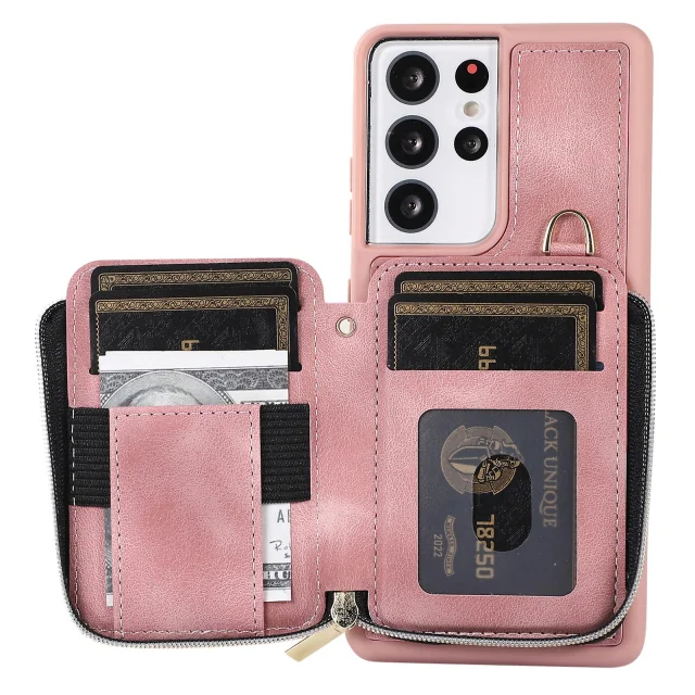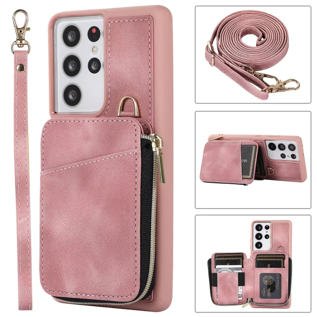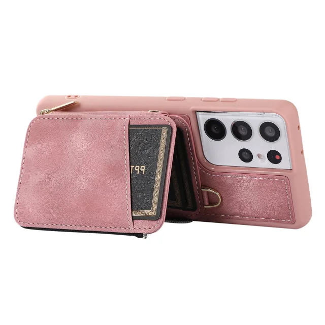 Za Samsung Galaxy S23 Ultra torbica za telefon s stojalom na zadrgo, torba za kartice, usnje + TPU ovitek za telefon s trakovi