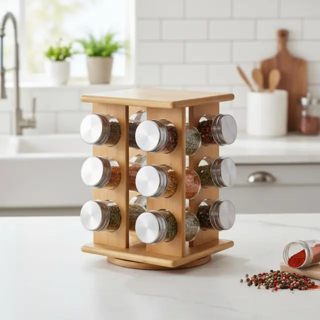 Začimbnik višine 23 cm združuje funkcionalnost in naravno eleganco. Vrtljivo stojalo, izdelano iz bambusovega lesa, omogoča enostaven dostop do vseh začimb ter hkrati doda toplino in naraven videz vaši kuhinji. Priloženih je 12 steklenih kozarcev za shranjevanje začimb, ki ohranjajo njihovo svežino in aromo, vsak pa je opremljen s pokrovom iz nerjavečega jekla za sodoben in trpežen zaključek. Praktična vrtljiva zasnova zagotavlja dober pregled in urejenost, zaradi česar je kuhanje še bolj prijetno in učinkovito.