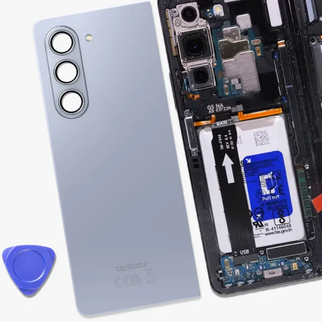Originalno proizvajalčevo spodnje zadnje steklo Glacier Blue za Samsung Galaxy Z Fold 5. Uradni kos, ki je popoln za popravilo vašega počenega, obrabljenega ali zlomljenega zadnjega pokrova. 100 % original (servisni paket), preizkušen pri Samsungu za zagotavljanje brezhibnega zadnjega stekla. Enako kot vaš obrabljen (barva, velikost itd.).