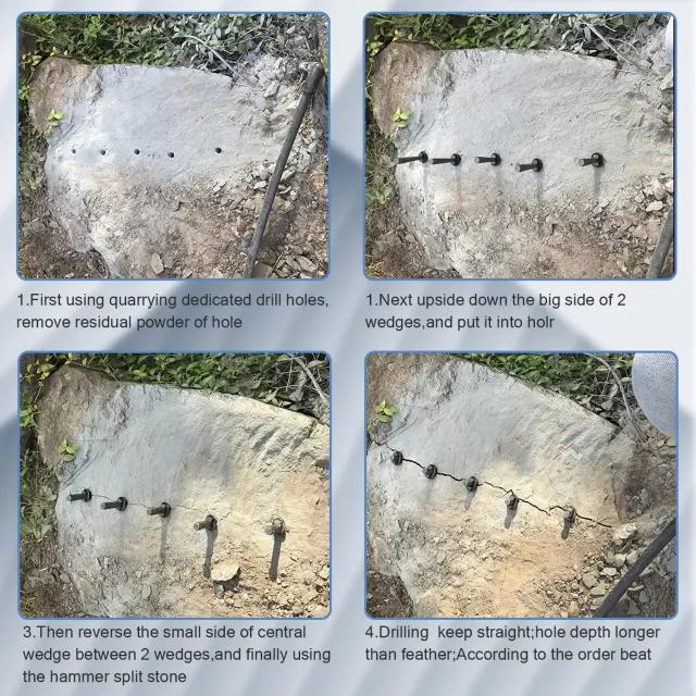 Cepljenje brez peskanja: cepilni klini se uporabljajo za cepljenje velikih, trdih kamnin brez peskanja. Lahko se uporablja za kamnite materiale, kot so granit, marmor in beton.