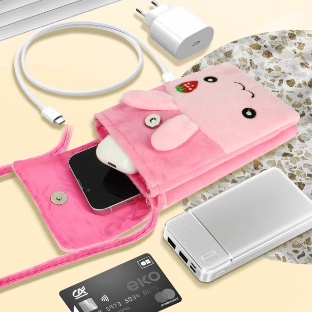 Zajcja torbica za telefon, naramnica, dvojni predal - roza Kawaii dizajn