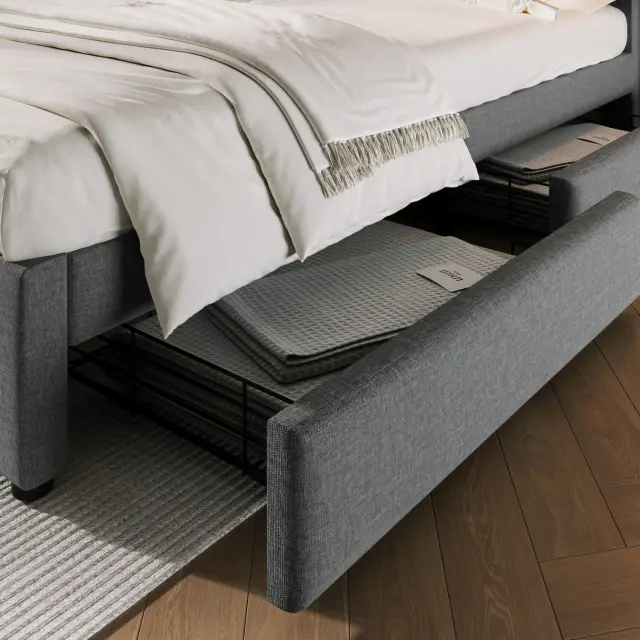 Oblazinjena postelja 140x200 cm (svetlo bež/siva). Največja nosilnost 300 kg. Vključuje 4 predale, USB in vtičnice. Potrebna je montaža. 143x204x92-104 cm.