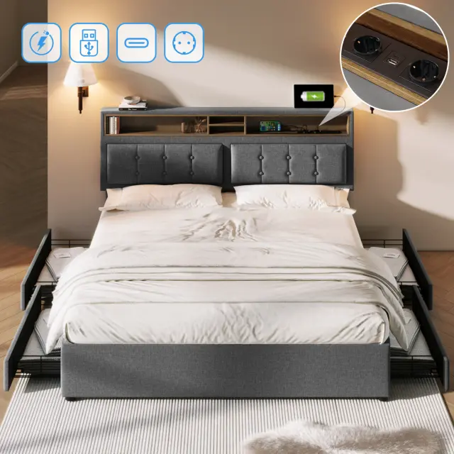 Zakonska postelja s 4 predali, USB-C, nastavljivo vzglavje, letveni okvir (140x200cm)