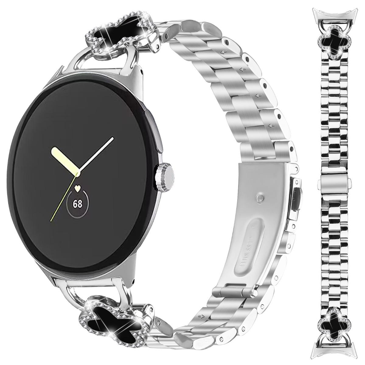 Eleganten dizajn s štiriperesno deteljico: Izboljšajte svojo uro Google Pixel s pridihom elegance. Oblika deteljice, okrašena s penečimi se okrasnimi kamenčki, doda prefinjeno in edinstveno estetiko vaši zapestju. Ta privlačna oblika je popolna za dodajanje osebnosti vašemu vsakdanjemu slogu. Izdelana s pozornostjo do detajlov, je deteljica simbol sreče in lepote, zaradi česar je idealen dodatek za vsako priložnost. Vgrajeni okrasni kamenčki zagotavljajo dodaten sloj šarma, lovijo svetlobo in opozarjajo na vaš brezhiben okus pri dodatkih. Oblika deteljice, združljiva z Google Pixel, naredi vašo uro bolj elegantno in opazno.