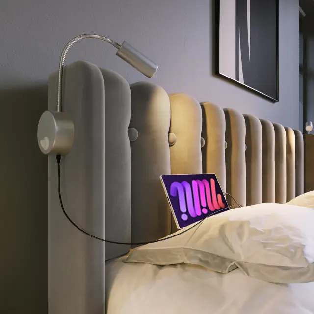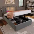 Žametna otroška postelja 90x200 z bralno lučko, polnilnim prostorom, vzglavjem za shranjevanje, letvenim okvirjem, sivo (brez vzmetnice)
