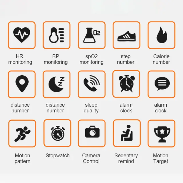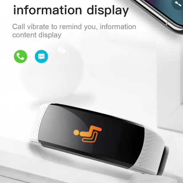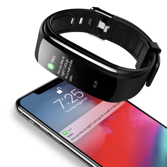 Veliko več funkcij: Fitnes zapestnica ponuja tudi številne praktične funkcije, kot so 5 športnih načinov, 4 stopnje svetlosti, vreme/temperatura, čas, datum, teden, koraki, poraba kalorij, merjenje razdalje, srčni utrip, krvni tlak, krvni kisik, nastavitve vadbe (tek, kolesarjenje, skakanje vrvi) in funkcija Find the Mobile. Po priklopu mobilnega telefona lahko kličete in pošiljate besedilna sporočila, poleg tega pa zapestnica omogoča funkcijo budilke, omogoča opomnike za sedenje in inteligentno funkcijo proti izgubi
