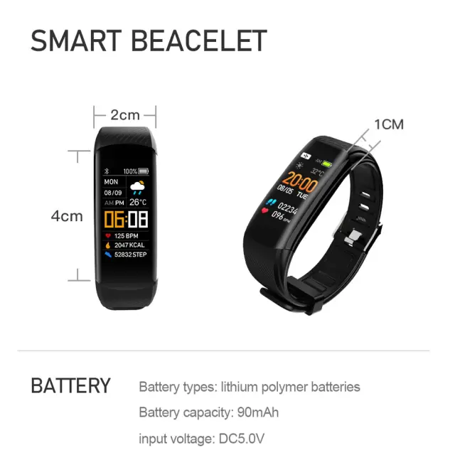 Zapestnica za aktivnost ponuja različne funkcije: temperaturo in vreme, čas, datum, teden, pedometer, porabo kalorij, merjenje razdalje, merilnik srčnega utripa, krvni tlak, kisik v krvi, nastavitve vadbe (tek, kolesarjenje, skakalna vrv) in iskanje mobilno funkcijo.
