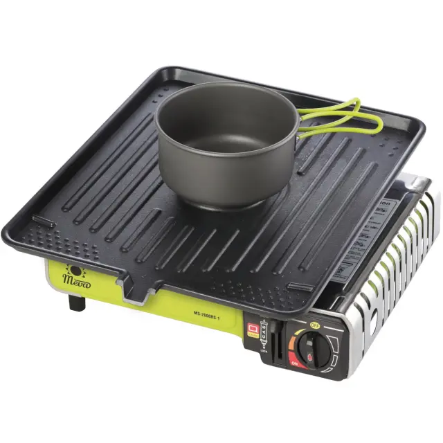 Učinkovita velika rešetkaza montažo na plinski štedilnik za kampiranje. Je popolna zamenjava za tradicionalni žar na oglje. Zelo hitro se segreje in doseže visoko temperaturo, kar vam omogoča maksimalno skrajšanje časa priprave jedi. Velika površina omogoča pripravo več porcij hkrati. Odprtina za plinski gorilnik vam omogoča hkratno kuhanje, cvrenje in peko hrane na žaru. Odvajanje maščobe omogoča bolj zdravo peko jedi na žaru.