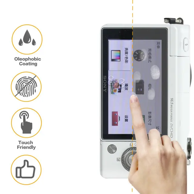 Odporen na praske in razbitje: ta zaščita zaslona, izdelana iz kaljenega stekla z visoko vsebnostjo aluminija, se ponaša z izjemno trdoto in učinkovito ščiti zaslon fotoaparata pred praskami, odrgninami in udarci ključev, kovancev in drugih ostrih predmetov.