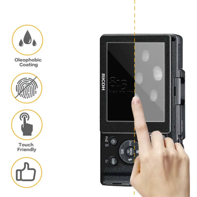 Izjemno tanek dizajn: pri debelini samo 0,26 mm ta zaščita zaslona zagotavlja neovirano občutljivost na dotik in ohranja izvirno izkušnjo gledanja vašega fotoaparata Ricoh GR II.