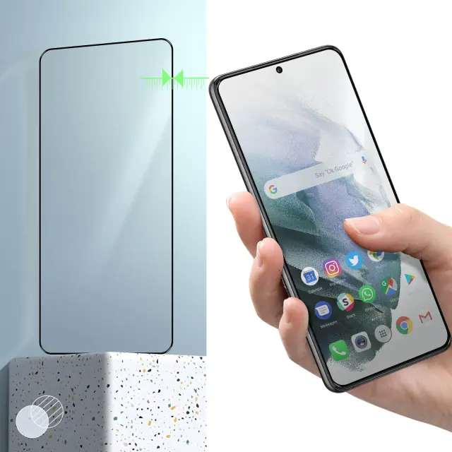 Zaščita zaslona iz kaljenega stekla s črno konturo, izdelana za vaš Samsung Galaxy S21 Plus. Učinkovito ščiti pred vsakodnevnimi udarci in praskami. Indeks trdote 9H, izdelan iz visokokakovostnega kaljenega stekla za odpornost v vseh okoliščinah. Poševni robovi in črna kontura za prilagajanje obliki vašega telefona.