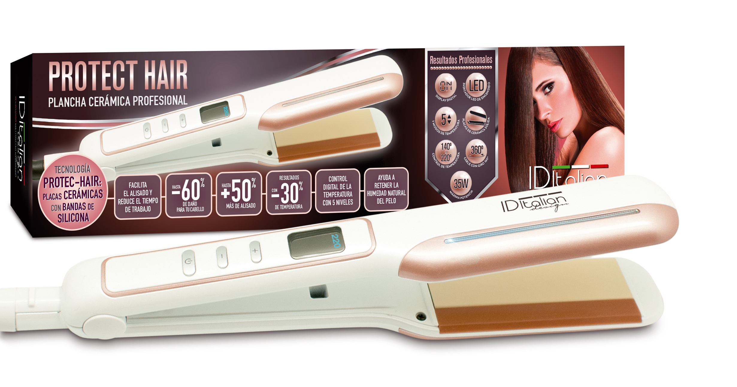 ID Italijanska družba z novim ravnalnikom za lase PROTEC HAIR, ki s 100-odstotno trdnimi keramičnimi ploščami, digitalno regulacijo temperature in silikonskim trakom optimizira stik med lasmi in ploščami, omogoča lažje ravnanje vsakega pramena in popolno ravnanje v enem prehodu, ščiti lase in jih ravna le pri 140-160º, čeprav digitalno doseže 220º, predstavlja napredek v tehnologiji. S svojimi inovativnimi silikonskimi trakovi omogoča manjše število potegov in nižjo temperaturo na laseh. Lasje se bolje razporedijo po ploščah in manj je neposrednega stika.
