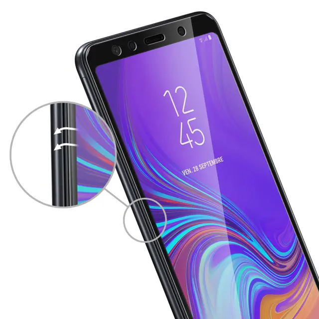 Zaščita zaslona, posebej zasnovana za Samsung Galaxy A7 (2018). Zaščita trdote 9H: izjemno odporna na praske, udarce, ostre predmete.. Poševni robovi za popolno prileganje zaslonu. Zaščita zaslona s črnimi obrisi, ki se ujema z dizajnom vaše naprave.