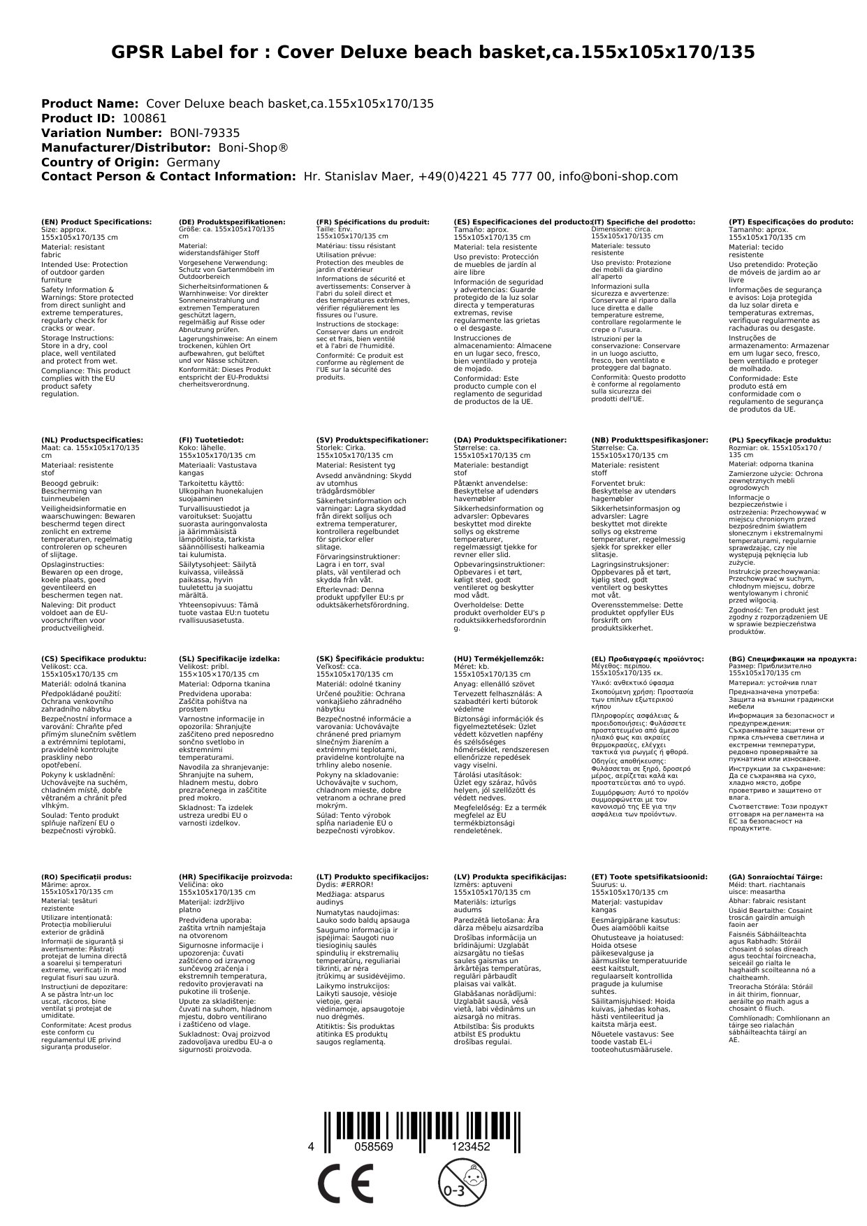 Zaščitna prevleka za plažni koš 130x105x170/135 cm iz trpežne polietilenske tkanine z UV-odpornostjo in zadrgo