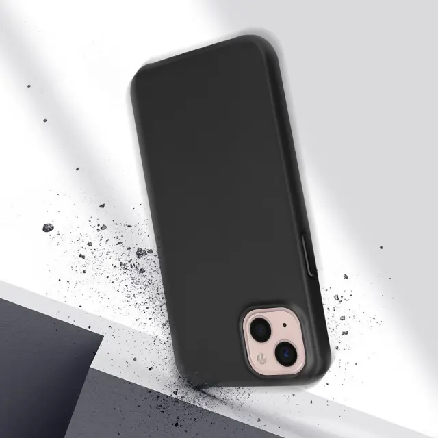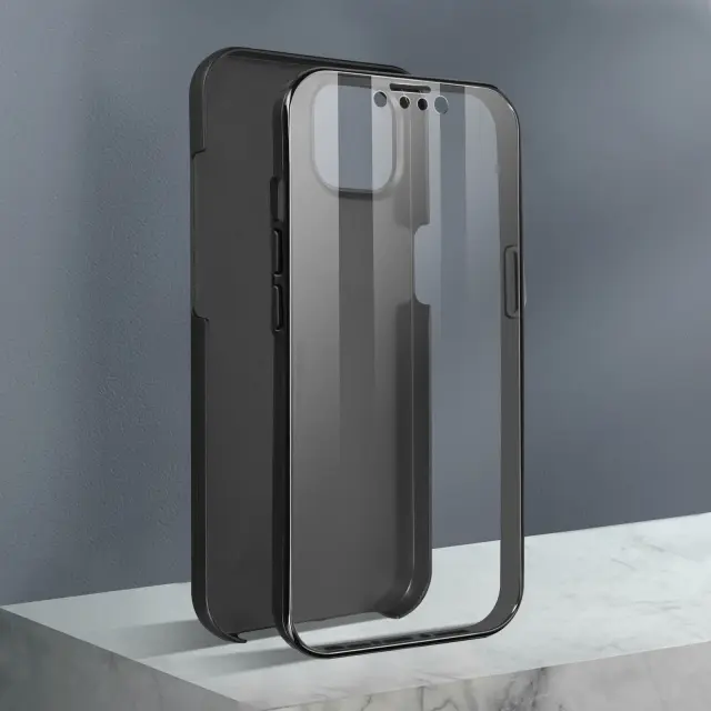 Crn ovitek za iPhone 13 Mini. Ta vsestranska 360-stopinjska zašcita ima trdo zadnjo stran iz polikarbonata, odporno na udarce, in nezlomljivo sprednjo stran iz polimera, ki pokriva zaslon in stran telefona.