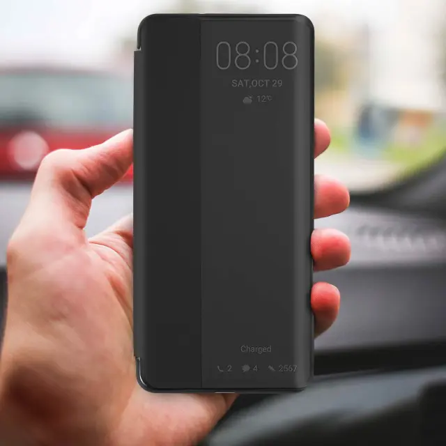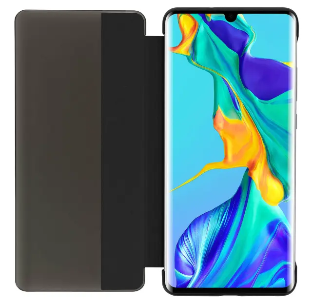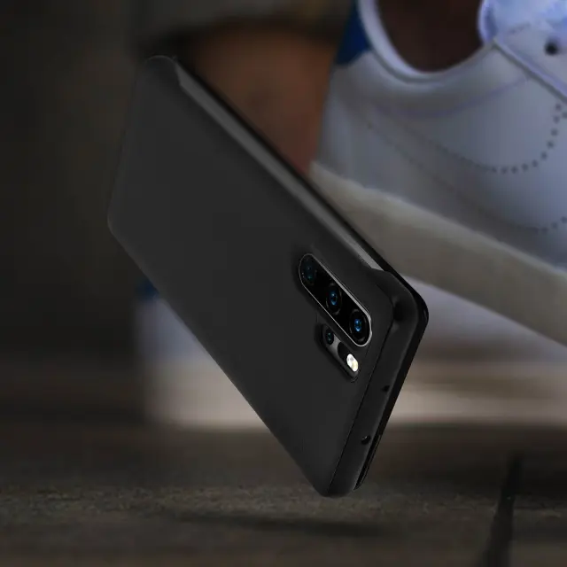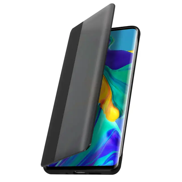 Zaščitna torbica posebej oblikovana za Huawei P30 Pro. Prosojno okno za ogled časa, obvestil itd. Trezen in eleganten dizajn z učinkom teksture. Zaščitni pokrov iz polikarbonata po meri.