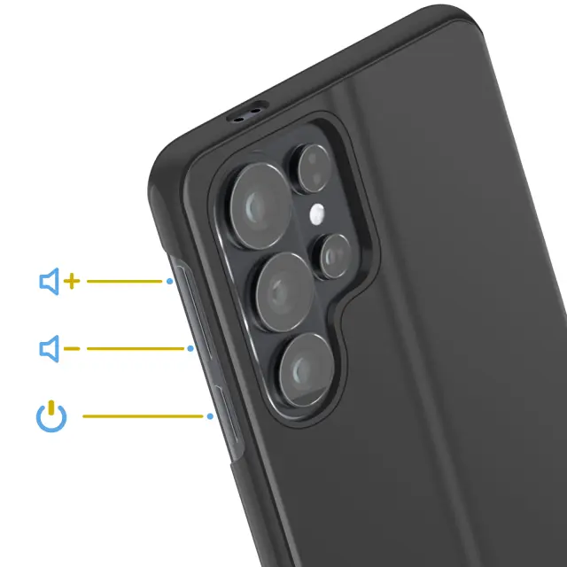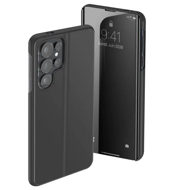 Ohišje Folio Smart View Mirror za Galaxy S26 Ultra, vsestranska zaščita za vsakdanje življenje. Polprosojna loputa: čas, klici in obvestila so vidni, ko se zaslon prižge. Trdna polikarbonatna lupina in mehka notranjost proti praskam za zmanjšanje mikro prask.. Stabilno zložljivo stojalo za videoposnetke in video klice, položaj za prostoročno uporabo.