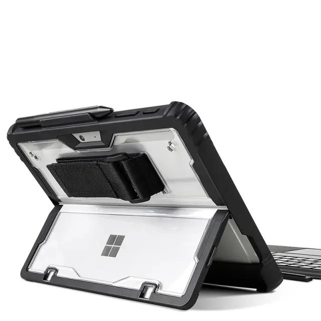 Funkcionalna zasnova: Poleg zaščite je to ohišje zasnovano s funkcionalnostjo v mislih. Vgrajeno stojalo omogoča udobne kote gledanja in tipkanja, kar je kot nalašč za delo ali zabavo. Natančni izrezi zagotavljajo enostaven dostop do vseh vrat in gumbov, ne da bi ovirali delovanje naprave. Prozorna hrbtna stran prikazuje originalno obliko vašega Surface Pro, medtem ko črni robovi dodajo pridih prefinjenosti. Izkusite brezhibno uporabnost in povečano produktivnost s tem premišljeno zasnovanim zaščitnim ohišjem.