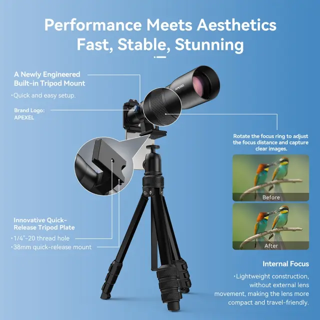 Stabilno in varno: Integrirana zasnova s fiksnim vijakom zagotavlja varno in stabilno povezavo med objektivom in vašim pametnim telefonom. To odpravlja neželeno gibanje in vibracije, kar ima za posledico ostrejše in stabilnejše slike, zlasti pri visokih stopnjah povečave. Združljiv s Huawei, Samsung, APPLE, je objektiv zasnovan za brezhibno delovanje s široko paleto modelov pametnih telefonov. Priloženi stativ zagotavlja dodatno stabilnost, kar vam omogoča zajemanje stabilnih posnetkov tudi v zahtevnih pogojih. Robustna konstrukcija zagotavlja, da lahko objektiv prenese težke pogoje uporabe na prostem, zaradi česar je idealen spremljevalec za vaše dogodivščine.