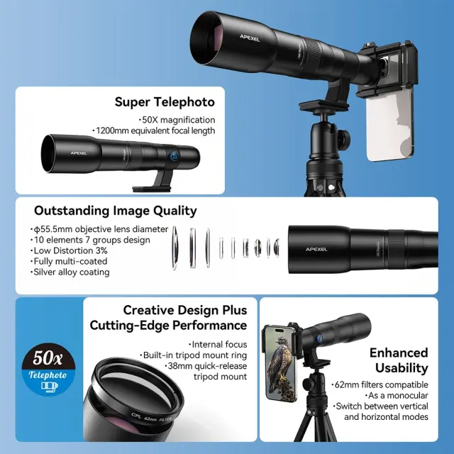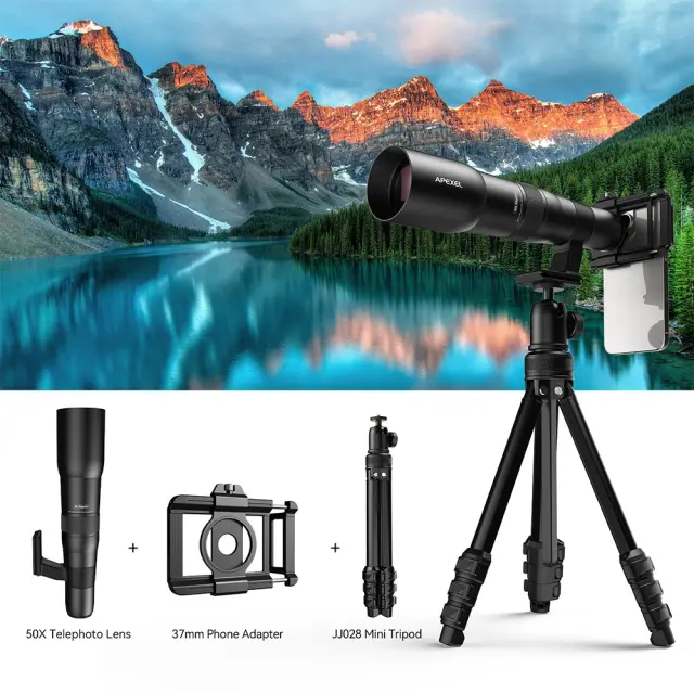 Izjemna jasnost slike: Doživite neprimerljivo jasnost slike z našim 50x zoom teleskopskim objektivom za pametni telefon. Napredna optična zasnova zmanjšuje popačenje (manj kot 3 %) in povečuje prepustnost svetlobe, kar zagotavlja svetlejše in ostrejše slike tudi pri šibki svetlobi. Združljiv s Huawei, Samsung, APPLE, ta objektiv spremeni vaš pametni telefon v zmogljivo orodje za slikanje, ki vam omogoča enostavno zajemanje fotografij in videoposnetkov profesionalne kakovosti. Notranji mehanizem ostrenja zagotavlja natančne nastavitve za optimalno jasnost na kateri koli razdalji.