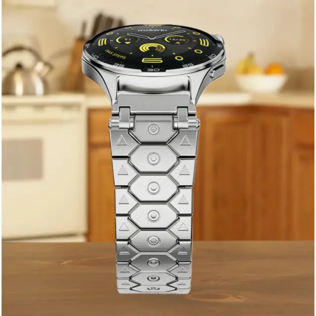 Stylish Hex design: S prepoznavnim šesterokotnim dizajnom členkov ta pašček za uro doda pridih sodobne prefinjenosti vaši pametni uri. Edinstven vzorec zagotavlja vizualno zanimivost in ločuje vašo uro od bolj tradicionalnih paščkov. Konstrukcija iz masivnega jekla izboljša splošno estetiko in ustvarja brezhibno mešanico oblike in funkcije. Ta natančno izdelan pašček, združljiv s Samsungom, ni le eleganten, temveč prispeva tudi k splošni zaznani vrednosti vaše pametne ure, zaradi česar je popoln dodatek za vsako priložnost.