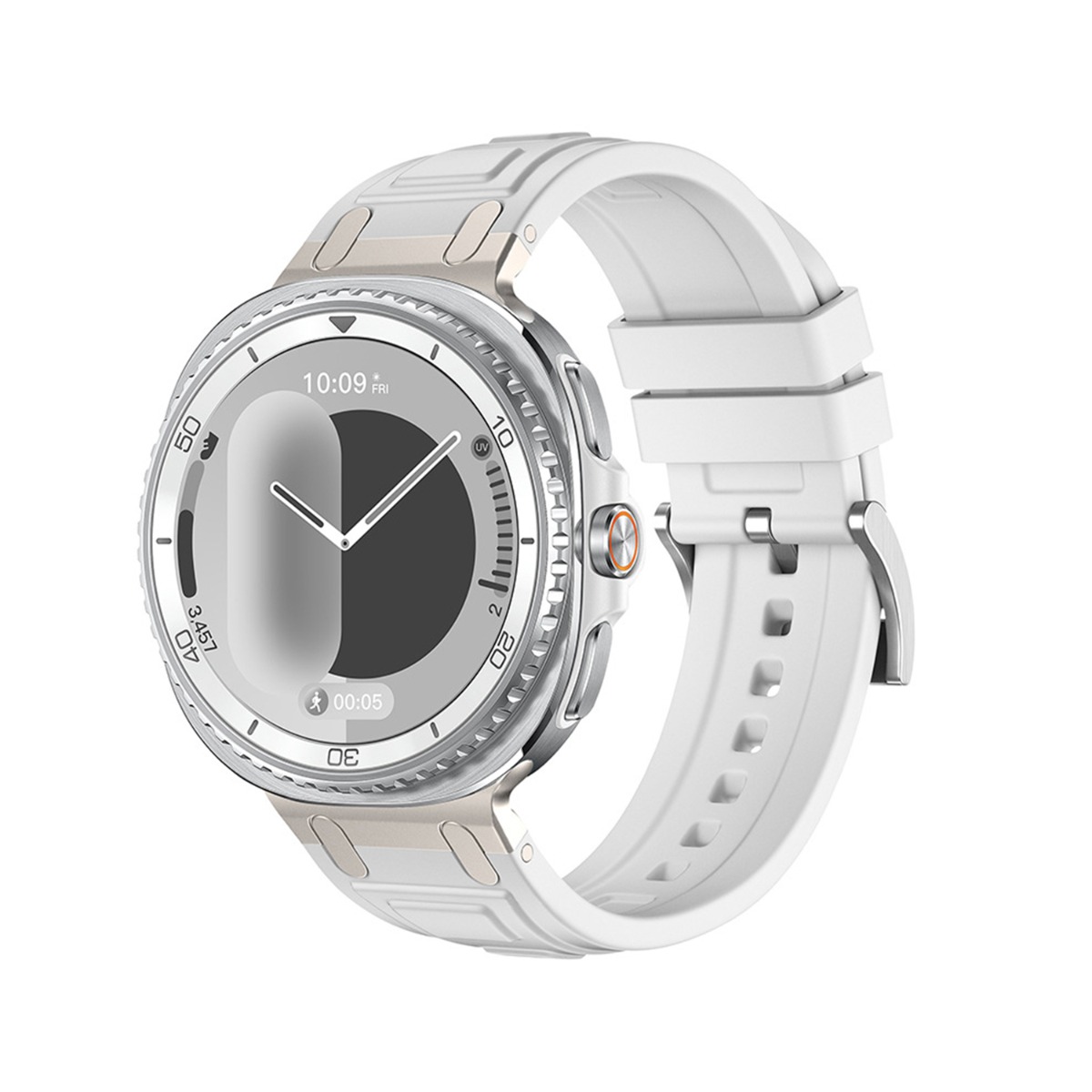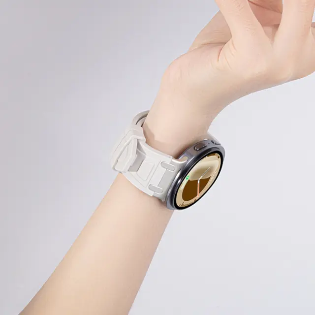 Udoben silikonski material: Ta pašček za uro, izdelan iz visokokakovostnega silikona, nudi udoben in gladek občutek na vaši koži. Mehak in prožen material je popoln za celodnevno nošenje, ne glede na to, ali ste v službi, telovadite ali se sproščate. Silikon je odporen tudi na znoj in vodo, zato je idealen za aktiven življenjski slog. Uživajte v vrhunskem udobju in prilagodljivosti s tem vrhunskim silikonskim pasom, združljivim s Samsung Galaxy Watch8. Gladka tekstura preprečuje draženje tudi pri dolgotrajni uporabi.