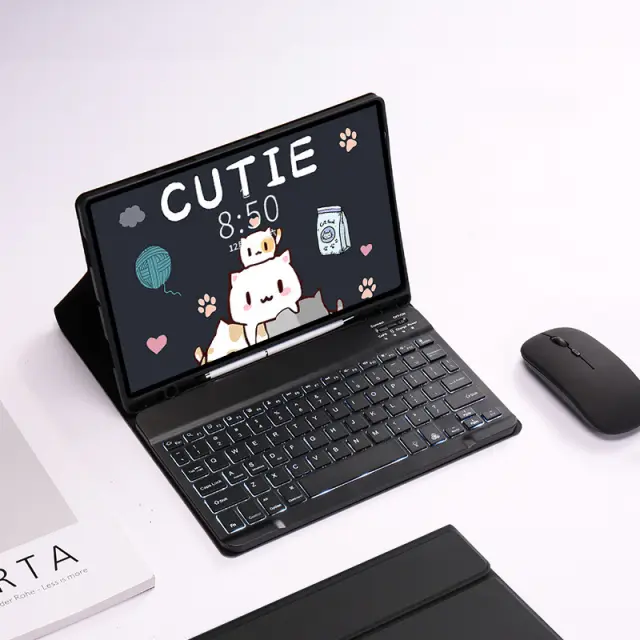 Udobno tipkanje in natančna navigacija: Tipkovnica z osvetlitvijo zagotavlja udobno tipkanje tudi v slabih svetlobnih pogojih, medtem ko miška omogoča natančno navigacijo in nadzor. Nastavljivo stojalo omogoča prilagajanje kota gledanja za optimalno udobje. S tem kompletom boste lahko učinkovito opravljali svoje delo, ne glede na to, kje ste. Predstavljajte si, da sedite v parku in brez težav pišete poročilo ali urejate fotografije, vse to zahvaljujoč udobju in natančnosti tega kompleta.