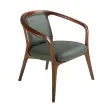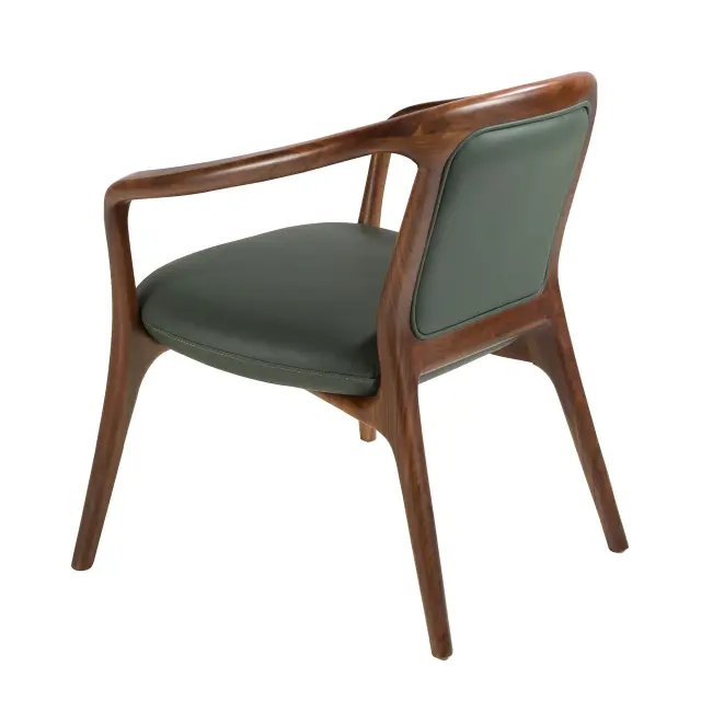 Sodoben dizajnerski fotelj z nasloni za roke ter sedežem in naslonjalom, oblazinjenima v temno zeleno umetno usnje. Zaradi svojega sloga in lesenih nog v barvi oreha je ta fotelj popolna kombinacija dizajna in udobja