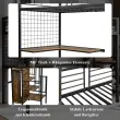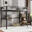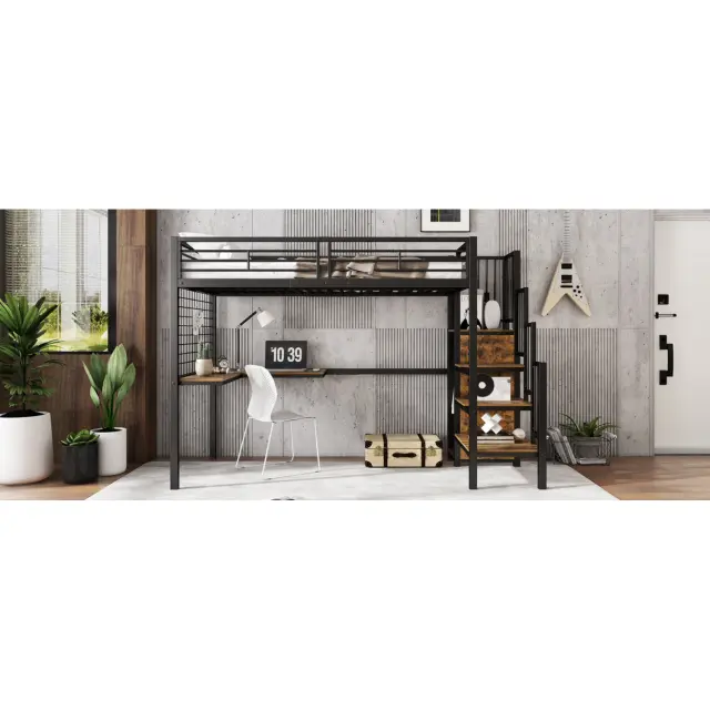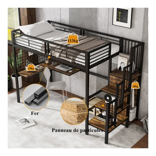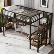 Železna postelja, pograd, podstrešna postelja, z mizo in omaro, črna/lesena, 90x200 cm