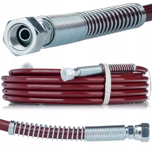 ✅ Vrtljivi priključki: Cev je opremljena z vrtljivimi priključki, ki močno olajšajo priključitev brizgalne pištole in napajalne enote. Vrtljivi elementi zmanjšujejo zvijanje cevi, kar zagotavlja udobje in svobodo gibanja med delovanjem.
