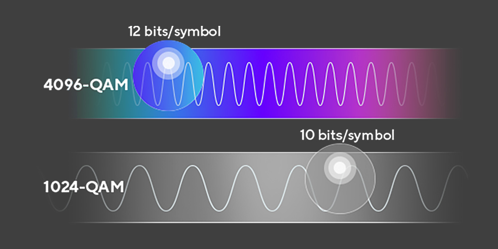 Tehnologija 4K-QAM poveča hitrost prenosa podatkov za do 20 % v primerjavi s tehnologijo WiFi 6/6E zaradi višjega QAM, ki gosteje povezuje signale, kar omogoča prenos in prenos več podatkov v enakem časovnem okviru kot prej.