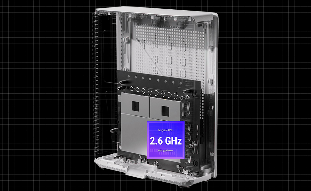 ZenWiFi BQ16 z zmogljivim štirijedrnim procesorjem s taktom 2,6 GHz in čipovjem WiFi naslednje generacije lahko premaga tudi največje zahteve in zagotavlja nemoteno upravljanje povezav 10 Gb/s ali visoko pasovno širino računalniških aplikacij v oblaku, kot so igre v oblaku ali generativna umetna inteligenca v realnem času. *Podatki so primerjani s taktom procesorja ZenWiFi Pro ET12.