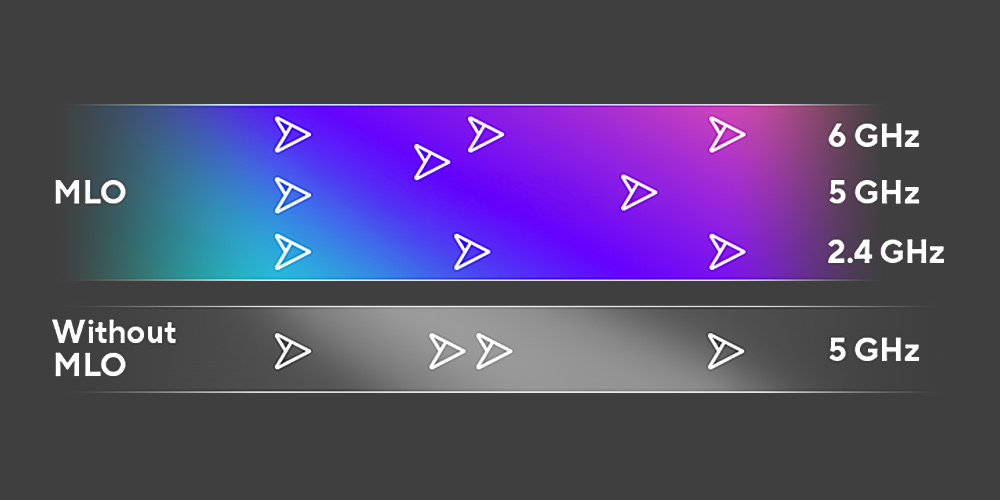 Inovativna funkcija Multi-Link Operation (MLO) izkorišča WiFi 7 z združevanjem ali brezhibnim preklapljanjem med pasovi 6 GHz, 5 GHz in 2,4 GHz hkrati, kar omogoča višje hitrosti in zanesljivejše povezave WiFi.