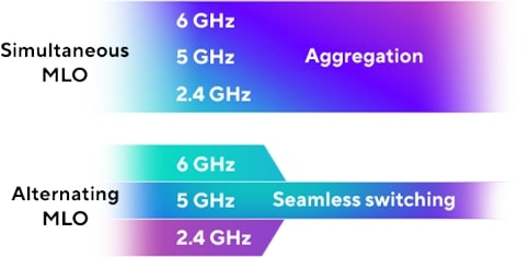Multi-Link Operation (MLO) omogoča povezavo brez bufferinga z inteligentnim kombiniranjem in preklapljanjem med pasovi 2,4 GHz, 5 GHz in 6 GHz. ZenWiFi BT8 je zasnovan tako, da je združljiv z vsemi napravami WiFi 7, ne glede na to, kateri način MLO uporabljajo. *Podprti načini MLO in pasovi se lahko razlikujejo glede na napravo. Podrobnosti najdete v specifikacijah naprave.