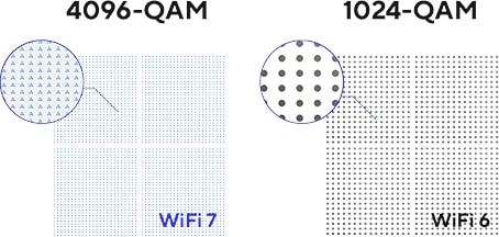 V primerjavi s 1024-QAM z WiFi 6/6E, 4096-QAM omogoča vsakemu signalu, da vključi večje količine podatkov, kar zagotavlja do 20 % učinkovitejši prenos podatkov*.