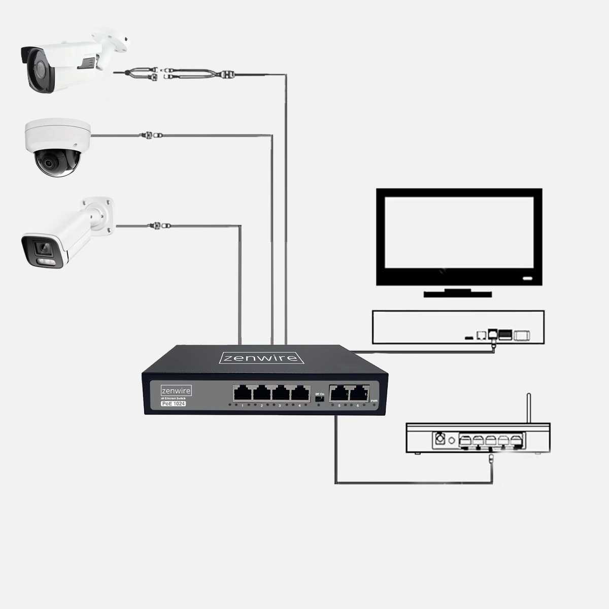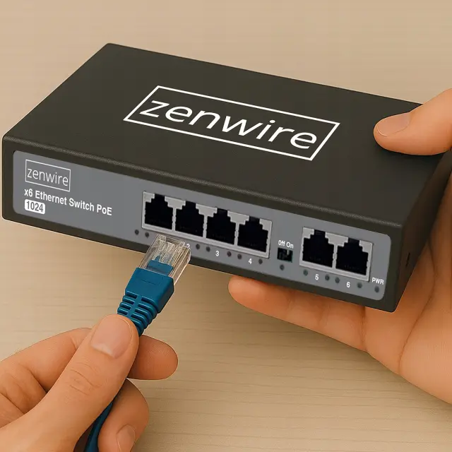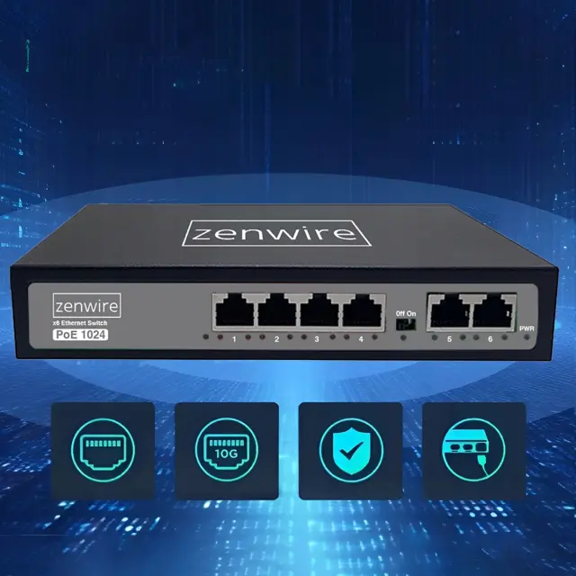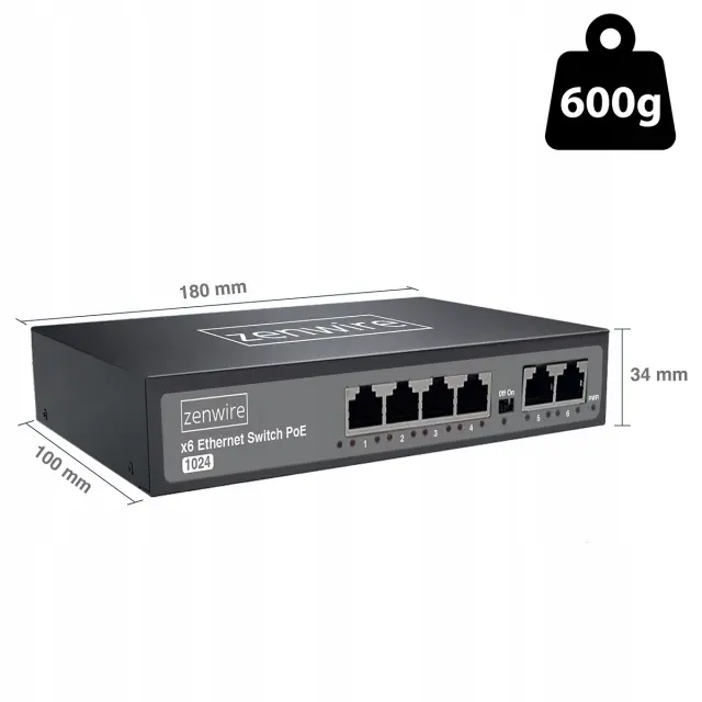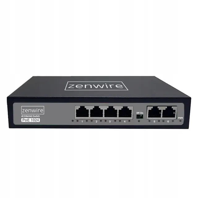 Stikalo Zenwire 1024 je praktična in zanesljiva naprava za vsako sodobno omrežje - doma ali v pisarni. Opremljen je s 4 priključki PoE in 2 priključkoma Uplink, zato lahko nanj preprosto priključite usmerjevalnik, NVR ali drugo stikalo. Z zmogljivostjo PoE do 60 W neposredno napaja kamere IP, dostopne točke ali telefone VoIP in tako odpravlja potrebo po dodatnih napajalnikih in kablih.