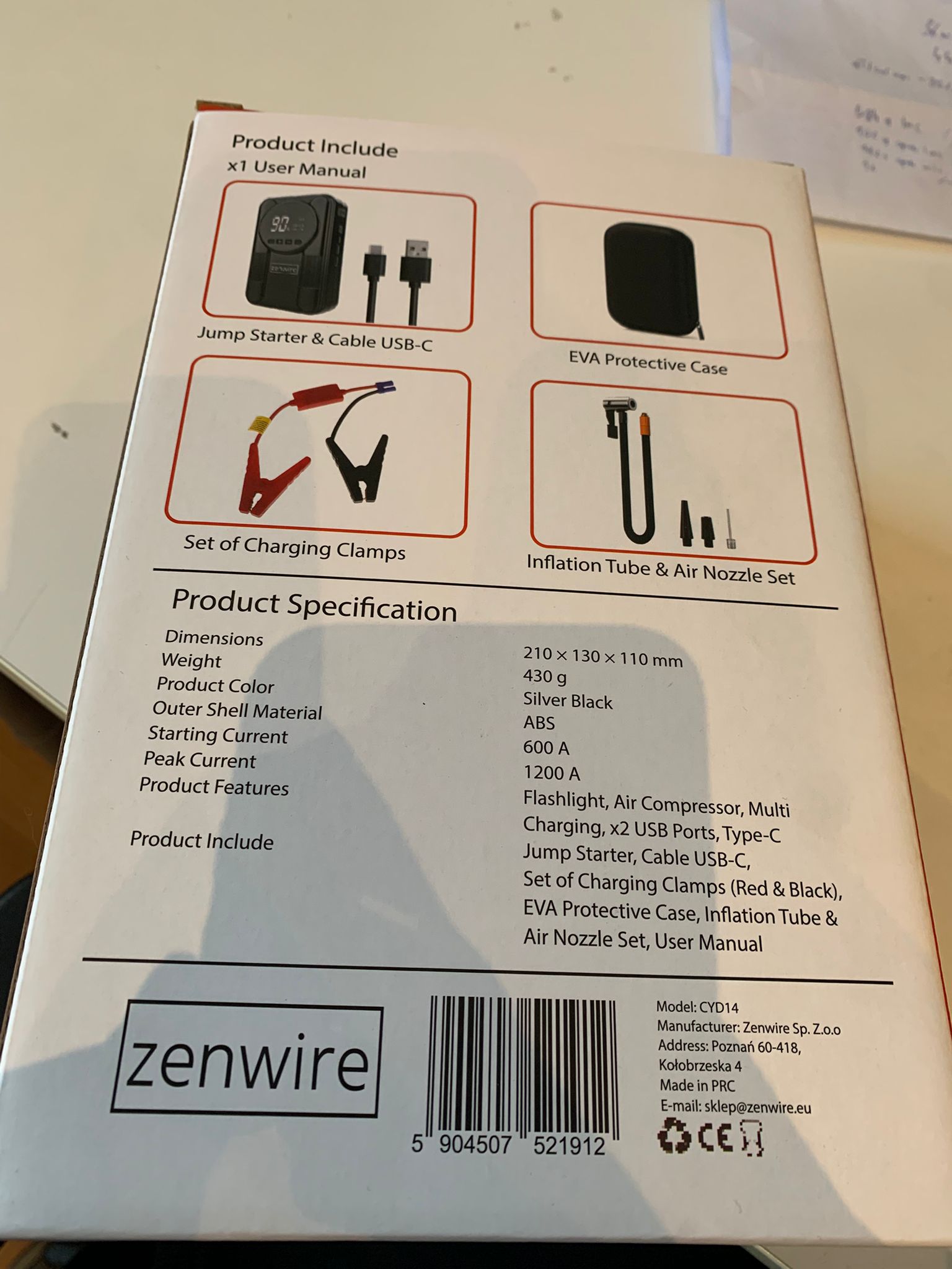 V kompletu prejmete: zagonsko napravo Zenwire CYD14, trpežno EVA torbico, zagonske kleme s priključkom EC5, USB‑C polnilni kabel, cev in nastavke za kompresor ter navodila (PL/EN). Ohišje iz trpežnega ABS in kovinske zlitine je zasnovano za odpornost na udarce in zanesljivo uporabo na poti.