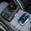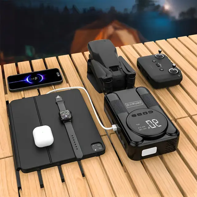 Vgrajeni kompresor z največjim tlakom 150 PSI (10,5 bar) in pretokom do 25 l/min je primeren za hitro dopolnitev tlaka v pnevmatikah avtomobila, motorja ali kolesa ter za napihovanje rekvizitov, kot so žoge ali zračne blazine. Na LCD zaslonu lahko spremljate ključne informacije, kot so stanje napolnjenosti in tlak, ter nastavite ciljno vrednost tlaka; kompresor se po doseženi nastavitvi samodejno ustavi, kar pomaga preprečiti prenapihovanje.