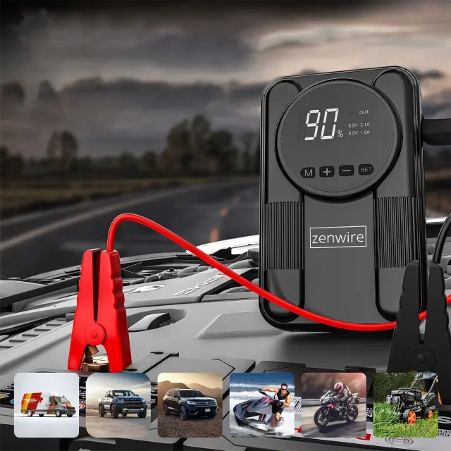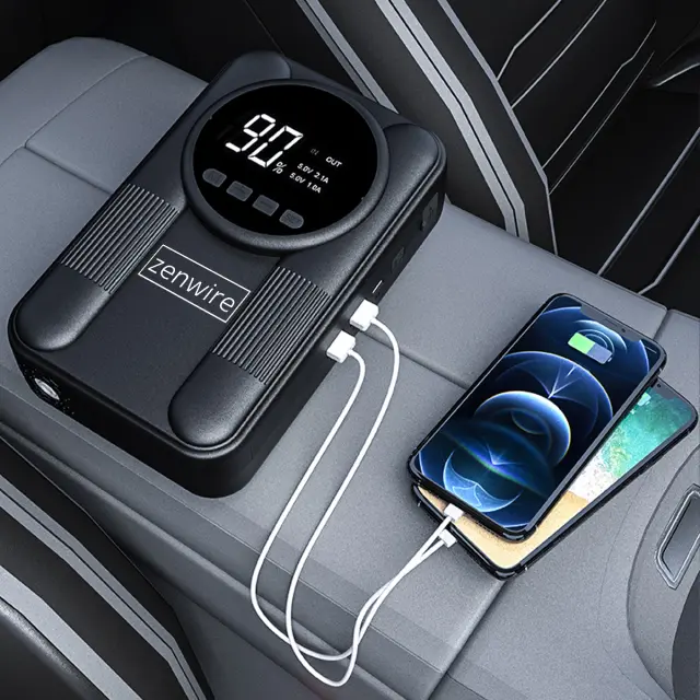 Zenwire CYD14 zagonska naprava za avto 12V 12000 mAh 2000A s kompresorjem 150 PSI, LCD zaslonom, powerbankom in LED svetilko je zanesljiva 4-v-1 rešitev za nujne primere na cesti, doma ali na terenu. V enem kompaktnem ohišju združuje močan zagonski booster za vozila z 12 V akumulatorjem, vgrajen zračni kompresor do 150 PSI, prenosno baterijo za polnjenje naprav ter LED svetilko za delo ponoči in signalizacijo.
