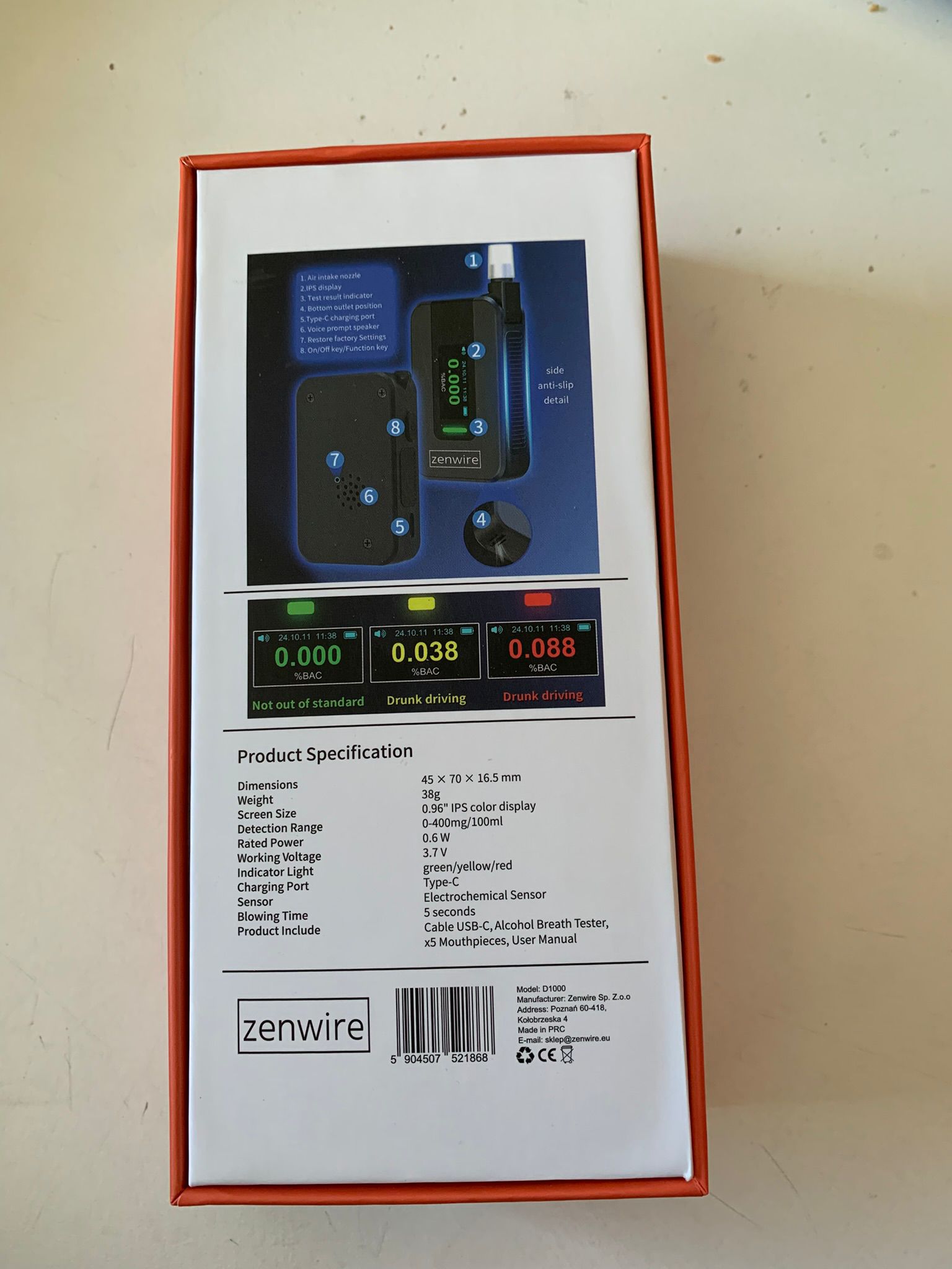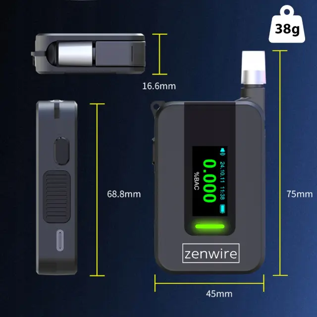 Vrhunski alkotest z elektrokemičnim senzorjem AI Zenwire D1000 z vgrajeno baterijo zagotavlja zelo visoko natančnost in ponovljivost rezultatov. Tehnologija, ki se uporablja tudi v policijskih alkotestih!