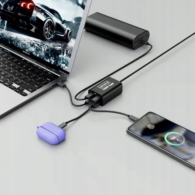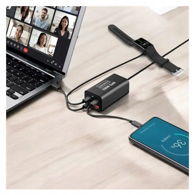 Polnilec GAN 3 Zenwire 100W s štirimi vrati (2x USB-C, 2x USB-A) omogoča hkratno polnjenje do štirih naprav. Z izhodno močjo do 100 W lahko hitro napolnite tudi zahtevno opremo, kot so prenosni računalniki, medtem ko lahko ostali priključki še vedno napajajo druge dodatke.