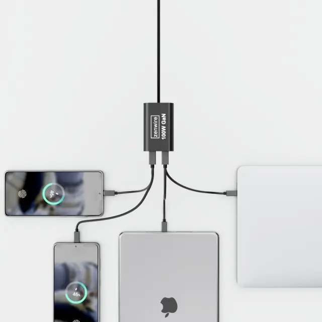 Zenwire GaN III 100W univerzalni polnilnik z 140 cm napajalnim kablom omogoča hitro polnjenje do štirih naprav hkrati (pametni telefoni, prenosni računalniki, tablični računalniki, pametne ure, slušalke).