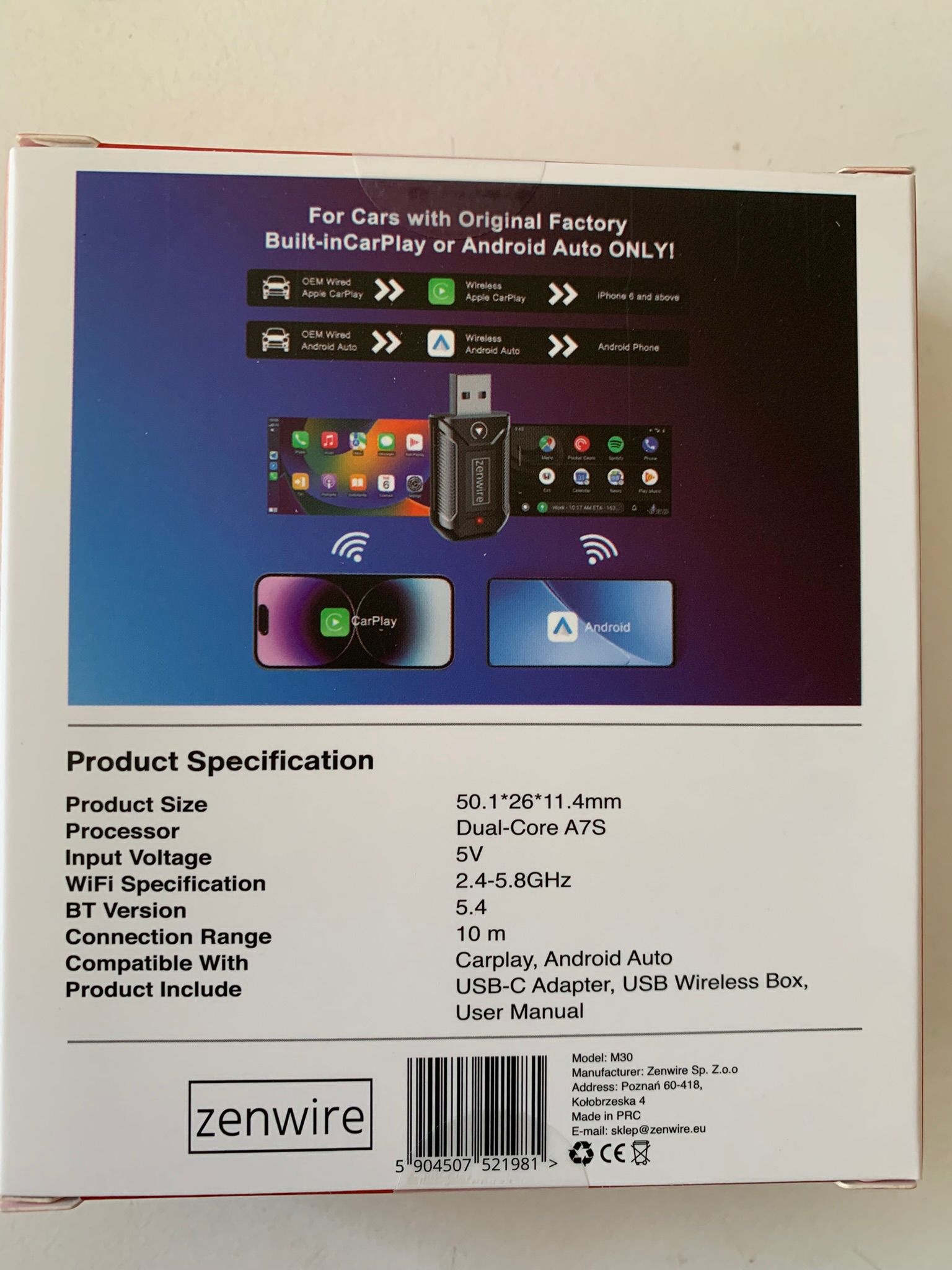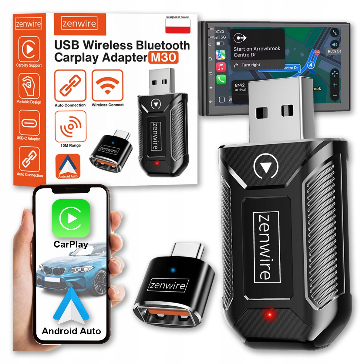 Zenwire M30 brezžični adapter za CarPlay/Android Auto USB/USB‑C, Wi‑Fi 2,4/5,8 GHz, Bluetooth 5.4