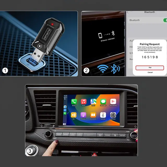 Namestitev je preprosta (Plug & Play): adapter priključite v isti priključek, kjer ste prej povezovali telefon za CarPlay/Android Auto, na telefonu potrdite povezavo prek Bluetooth, nato se naprava samodejno preklopi na Wi‑Fi in sistem je pripravljen. Po prvi nastavitvi se povezovanje izvaja samodejno ob vsakem naslednjem vžigu vozila.